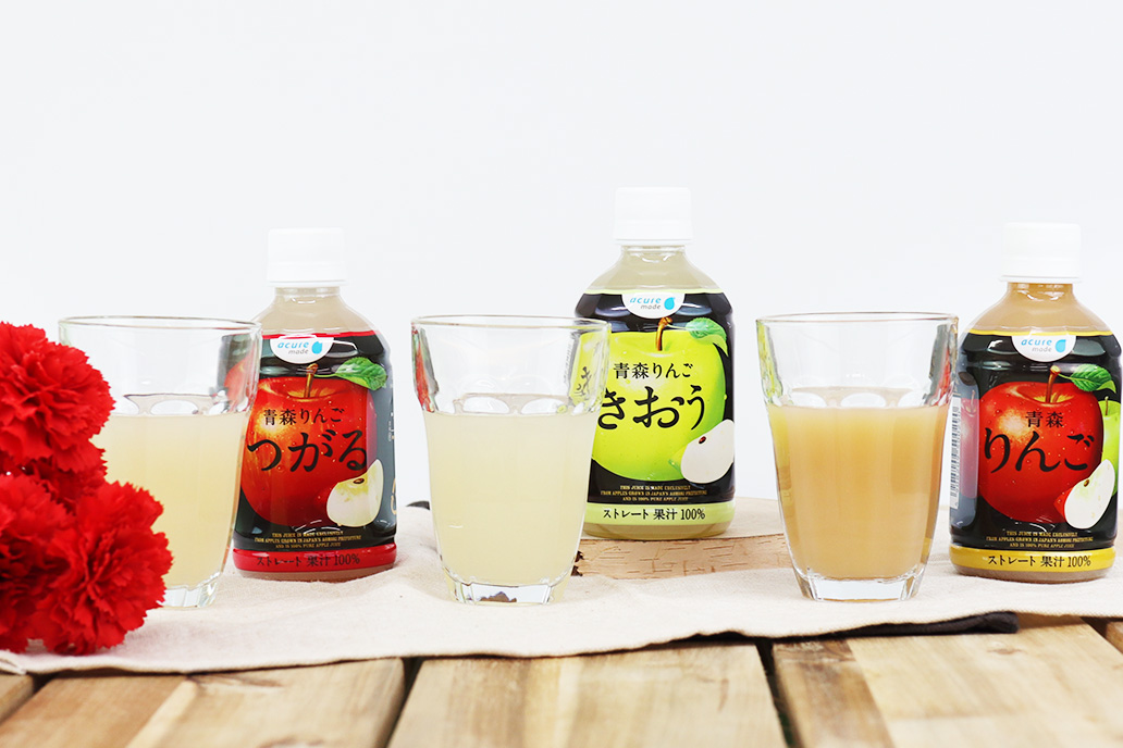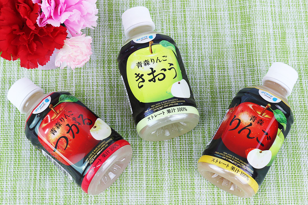 アキュアメイドの「青森りんごシリーズ」は、1本に約1.5個分ものりんごを使用したストレートジュース。まるで本物の果実を食べたような満足感が魅力です。
